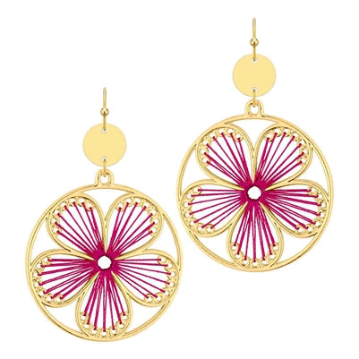 Add a pop of color to your ensemble with our Gold Open Circle Earrings featuring a playful Hot Pink Threaded Flower. These 1.5 inch dangle earrings ar