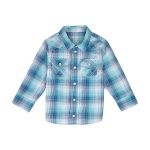 Upgrade your baby’s wardrobe with the stylish and durable Wrangler Baby Turquoise Plaid Shirt. The 100% cotton fabric ensures comfort and breathability for your little one, while the full snap closure and double chest pocket with snaps add convenience. The classic plaid design, front and back yoke, and single snap wide cuffs make your baby stand out in style.