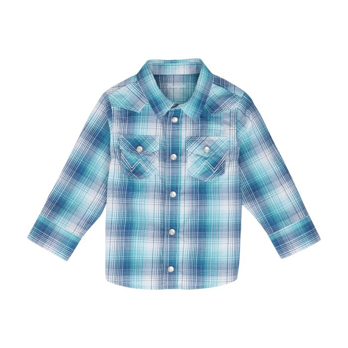Upgrade your baby's wardrobe with the stylish and durable Wrangler Baby Turquoise Plaid Shirt. The 100% cotton fabric ensures comfort and breathabilit